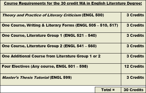 So in other words a student can take ENGL 540 Magic in Literature and ENGL 540 Mastering the Past, two different courses running at different semesters by the same 540 course code. Or, a student taking ENGL 560 African and Caribbean Lit. this spring semester can take ENGL 560 Hemingway: Modern Cryptography in the fall. As long as you’re keeping your ten-course/30-credit requirement in view, and are adhering to it, all will be fine. As a reminder, here’s that ten-course/30-credit degree requirement: