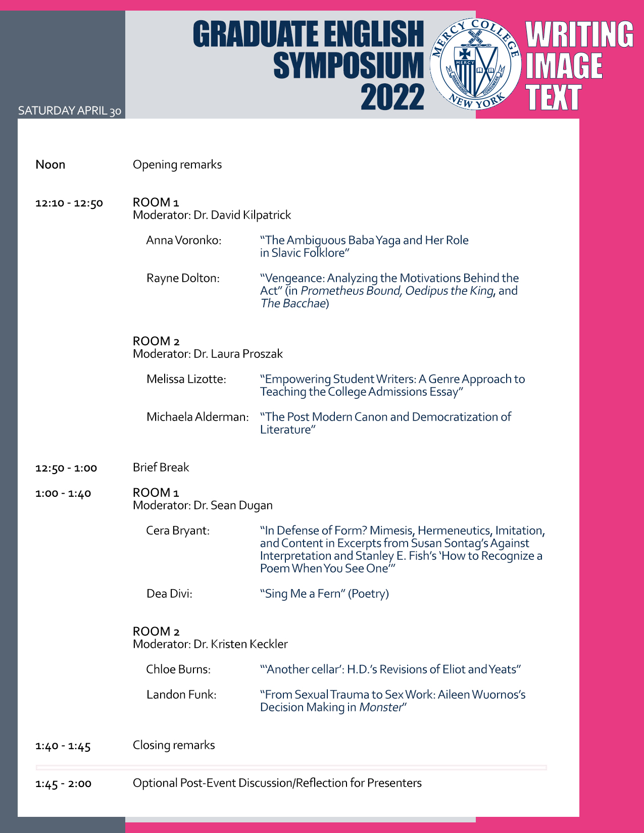 It’s the end of the academic year, which means it’s time to celebrate! One way we celebrate, as a graduate community, is with the annual graduate student symposium, which this year was held live-online at the end of April. Eight grad students presented a variety of scholarly and creative work. Four graduate faculty members moderated the different sessions. Other program faculty, and an Associate Provost of the college, were in attendance, as were a number of other active MA students and alumni. It was an interesting, idea-filled, and collegial event. Click the banner below to see the program for the event, and to get a look at the topics on which students presented: