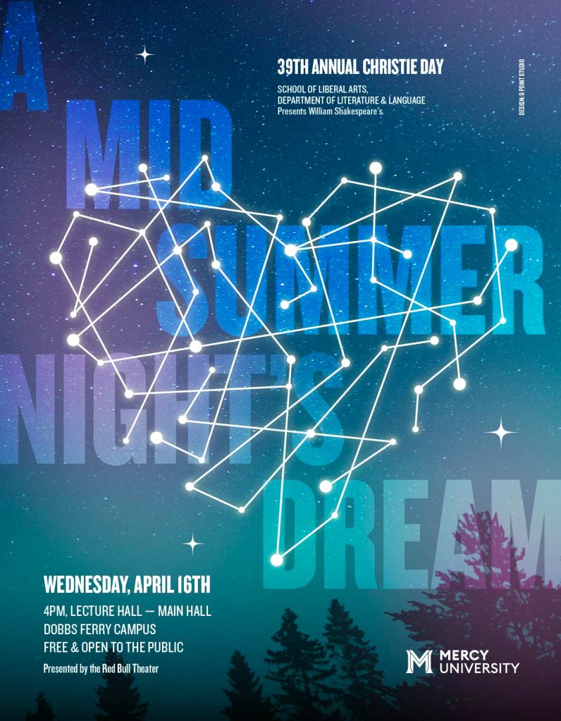 Anyone in the area of the Dobbs Ferry campus this coming Wednesday, 4/16, should come over and enjoy a performance of A Midsummer Night’s Dream by Red Bull Theater and Apocalyptic Artists. The show starts at 4pm in the Main Hall Lecture Hall, and should run until 5:30pm. The cast will hold Q&A afterward until 6pm. Admissions is free and it’s open to both students and the community, so anyone is welcome to attend. This is for the English program’s annual “Christie Day” Shakespeare event held in honor of the late Joannes Christie, founding faculty of the Mercy English program.