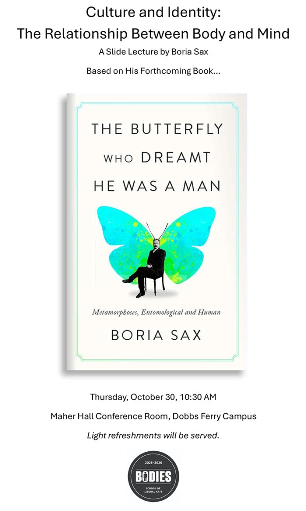 Good news for grad students able to reach the Dobbs Ferry campus: Our own Dr. Boria Sax will be discussing his forthcoming book The Butterfly Who Dreamt He Was a Man this Thursday, October 30, at 10:30am in the Maher Hall Conference Room. This is part of the School of Liberal Arts’ 2025-26 thematic series of events on Bodies. The MA English Lit program strongly encourages anyone in the area to come over to campus on Thursday morning. For directions to Maher Hall or more info, write to cloots@mercy.edu.