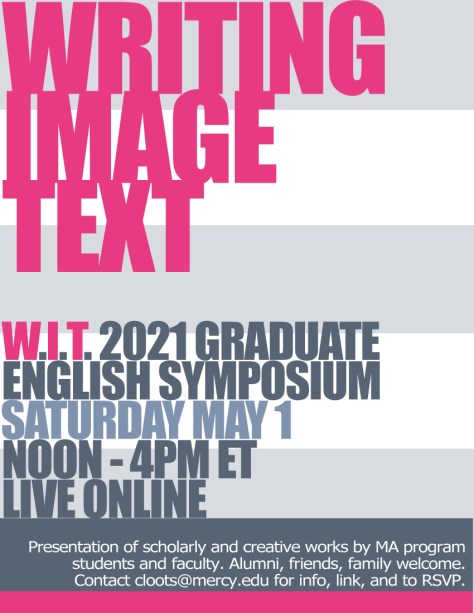On Saturday May 1st the MA program will be hosting its annual “Writing Image Text” or “W.I.T.” Graduate English Symposium. The event will be held live online through Zoom. We will begin at noon, eastern time. Tentatively we are estimating the event will run from noon to 4pm, but that might change depending on how many MA students declare that they will present a scholarly or creative work. It’s possible that because this is going to be online, and therefore more easily accessible to all of our students, that we will get an extraordinarily large turnout of presenters. We shall see. For this reason we are at this moment limiting our call for papers (CFP) to current students in the program. We hope our alumni will join us in the virtual audience; and should the CFP result in a lower-than-expected response from current students we will open the CFP to our alumni.
